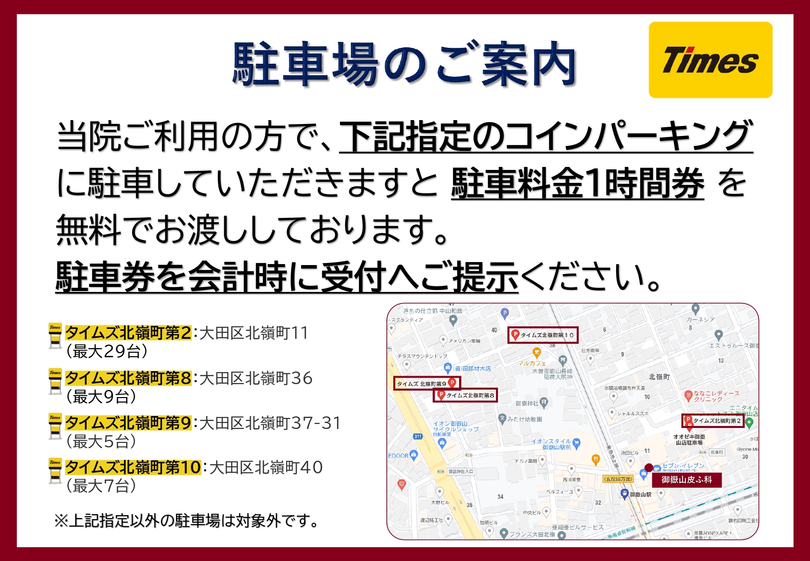 - 当院ご利用の方で、下記指定のコインパーキングに駐車していただきますと 駐車料金1時間券 を無料でお渡ししております。